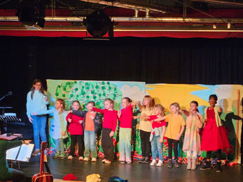 Der Beginn des Stücks wurde musikalisch eingeleitet, bevor die Kinder vor und auf die Bühne traten und gemeinsam mit dem Publikum das erste Lied “Hallo ciao ciao, guten Tag, moin moin”